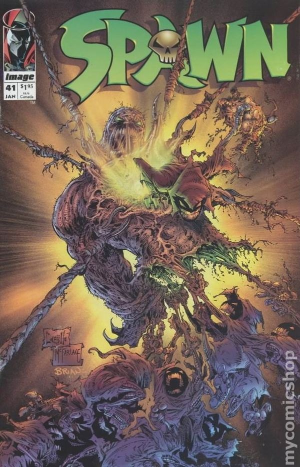 "Fugitives: Part 2 of 2!" Written by Todd McFarlane. Art and cover by Greg Capullo and Todd McFarlane. Curse continues his sadistic torture of Spawn. With the physical part complete, he begins to mentally dissect Spawn, searching for the knowledge that will enable him to overpower the master of all evil. Spawns uniform eventually wins the fight to come to life, and reassembles. As Spawn is engulfed by its force, the maniacal Curse lunges for a switch, self-destructing the castle and everything in it. Elsewhere, Cy-Gor continues his journey towards New York City for an as yet undetermined reason. 32 pages, FC. NOTE: This issue is dedicated to Michael Golden. Cover price $1.95.