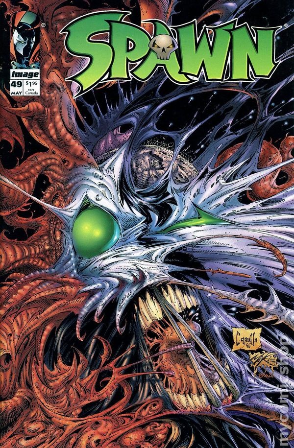 "Helter Skelter!" Written by Todd McFarlane. Art and cover by Greg Capullo and Danny Miki. Al confides in Granny Blake his fears for her safety if he continues to visit her but, his concern is met with a gentle sermon. When Cogliostro breaks into Spawns personal asylum, he discovers that the costume is beginning to possess him. Cogliostro, showing no fear, is swallowed and vomited by the cape. Able to free Al from the evil capes grip, Cog admonishes him to harness its power. Finally, Al humbly asks cog for help. Terry visits the doctor who orders routine tests. Preoccupied with his pending test results and the reconstruction of Wynn's murder conspiracy against him, Terry blacks out on the drive home, becomes involved in a serious accident and ends up in the hospital. Cy-Gor lurks in New York City concrete jungle looking for Simmons. On edge since the mysterious file was slipped under their door and feeling the financial pressure of starting their new business, Twitch pulls his gun when the car blows a rod. Sam calms the apologetic Twitch down and says he has a little surprise for him. 32 pages, FC. NOTE: This issue is dedicated to Michiko Mitsey Miki. Cover price $1.95.