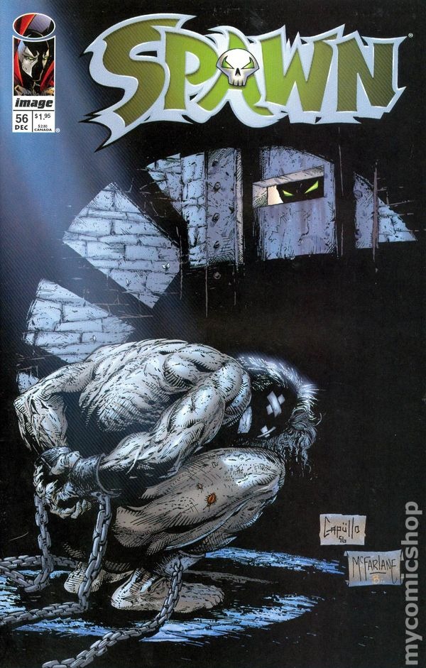 "Kahn!" Written by Todd McFarlane. Art by Todd McFarlane, Greg Capullo and Danny Miki. Cover by Greg Capullo. Major Forsberg, a military strategist, has been kidnapped and imprisoned by Jason Wynn, a key figure in U.S. foreign intelligence. Forsberg had determined the insights of the great conqueror Genghis Kahn and relayed some of this to Wynn. When Forsberg denied having full knowledge, Wynn slaughtered his family before his eyes. Driven mad by the sight, Forsberg perceives that Kahn's spirit inhabits Wynn and therefore suffers guilt for creating this power-mad, geopolitically murderous monster. Terry Fitzgerald directs Spawn to free Forsberg from Wynn's prison while working undercover in Wynn's office to undermine his influence. Meanwhile, the Clown continues to direct Wynn in a campaign to eradicate Spawn as Cy-Gor waits in Spawns rat-infested domain. 32 pages, FC. NOTE: This issue is dedicated to Robert McFarlane. Cover price $1.95.