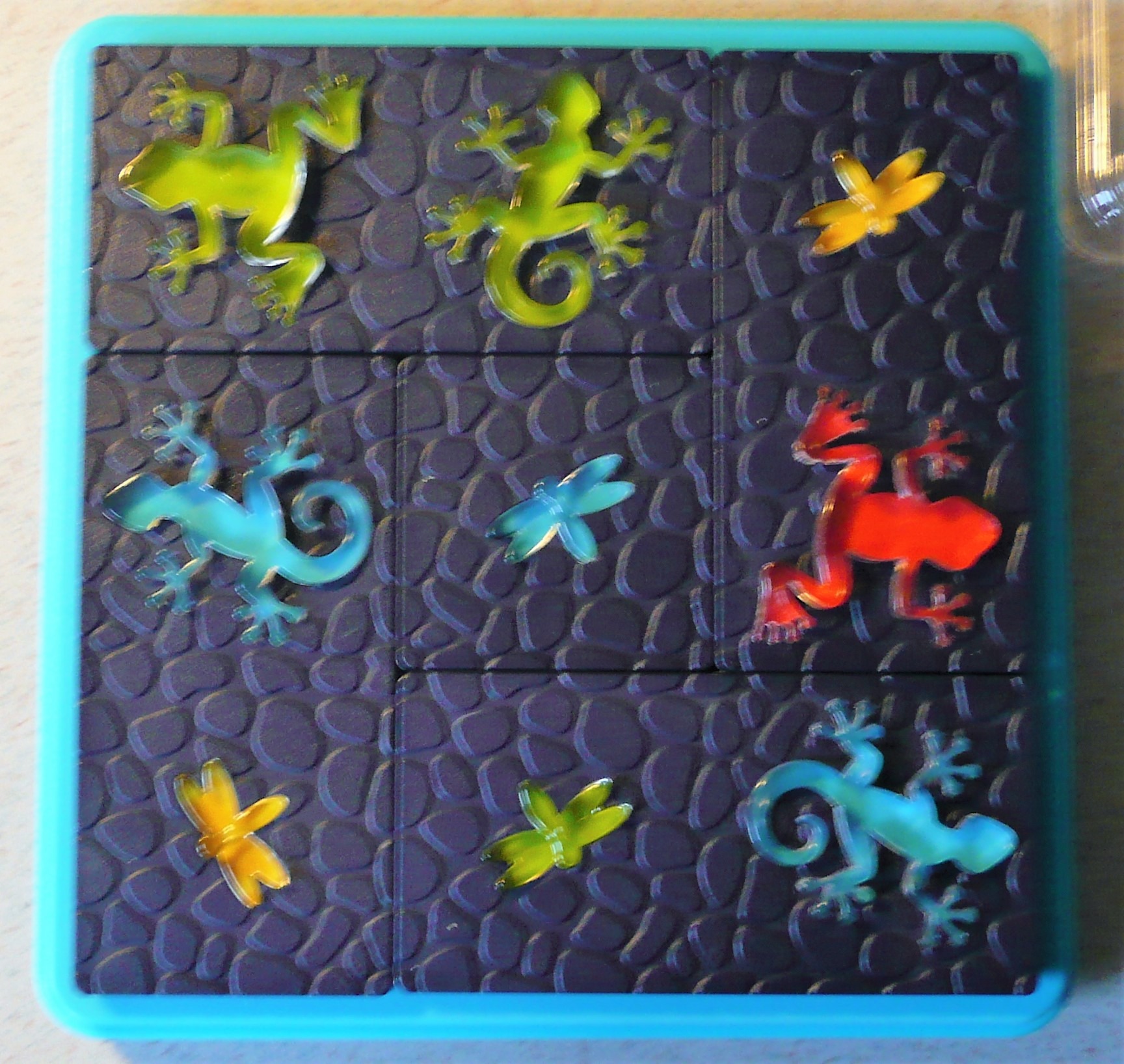 Plaats alle puzzelstukken op het spelbord, zodat de kikkers en salamanders dezelfde kleur krijgen als in de opdracht. Maar kijk uit! De dieren zijn transparant en veranderen vankleur, naargelang de ondergrond waarop ze geplaatst worden.