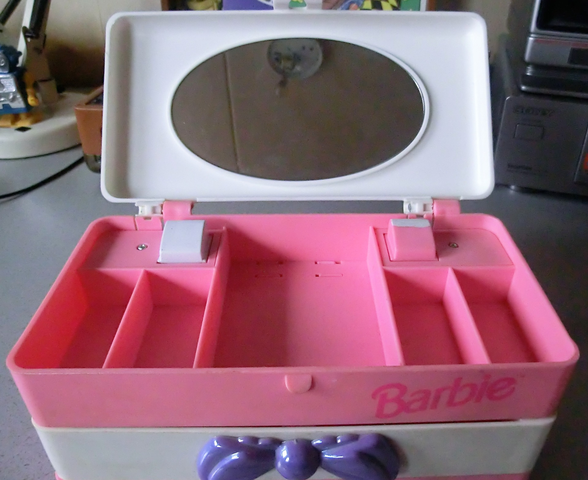Aan de bovenkant kun je het deksel openen en tref je opbergvakjes en een spiegel.