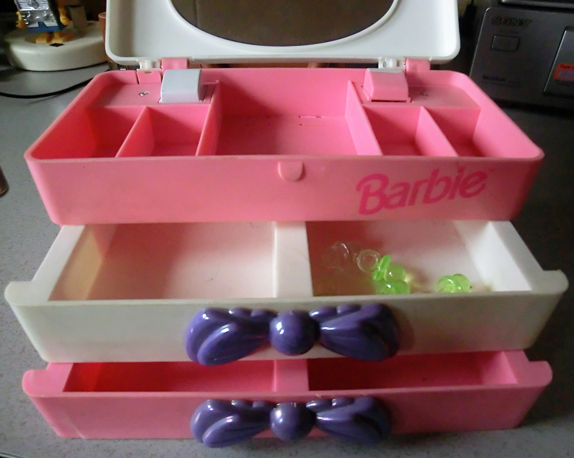 Via de 2 drukknoppen kun je de lade's er onder openen om spulletjes in op te bergen.
