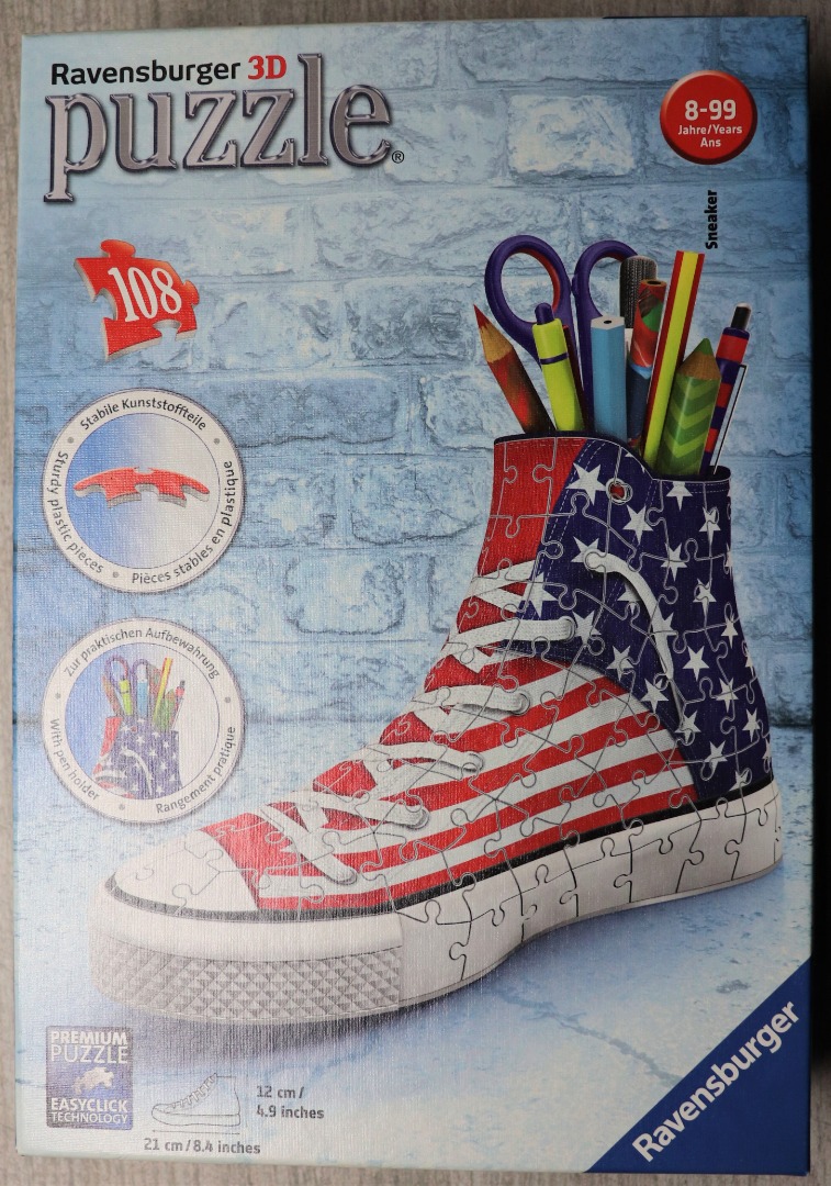 3D-puzzelplezier voor alle Galaxy fans. Coole stijl, leuk design en een spannend interieur. De stijlvolle sneaker met een geweldig design is niet alleen een optische blikvanger in elke kinderkamer, maar biedt ook voldoende ruimte voor belangrijke accessoires. Eindelijk een 3D-puzzel, die niet alleen puzzelplezier biedt, maar na de succesvolle samenstellingen goede diensten biedt: want de 108 genummerde kunststof puzzelstukjes en de perfect passende accessoires worden een praktische opbergsneaker. Voor pennen, knutselspullen of al het andere, dat te jammer is om gewoon rond te liggen. Hoewel er een beetje puzzelvaardigheid nodig is om de sneakers samen te stellen, maar met de gedetailleerde handleiding en de kleine nummers die op de deels gebogen puzzelstukjes te vinden zijn, is het puzzelen snel gecreëerd. En al heeft elke tienerkamer een nieuwe blikvanger met veel ruimte voor allerlei soorten accessoires.