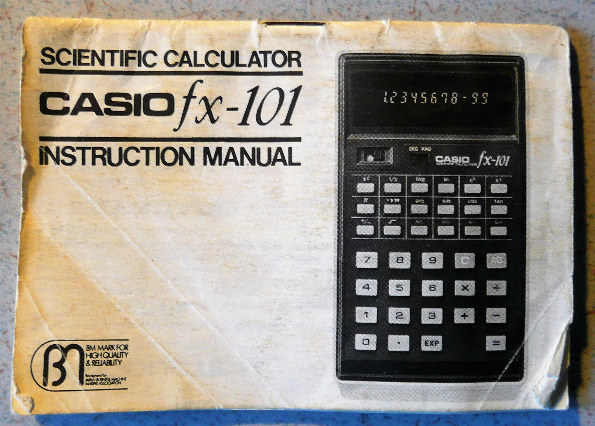 The Casio fx-101 is a scientific calculator with 10 digits precision and algebraic logic. It has 21 functions, 37 keys, and a VFD (vacuum fluorescent) display. The power source is 4xAA. The calculator was manufactured in Japan.