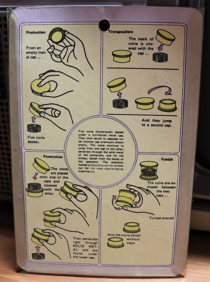 Five ten pence coins mysteriously appear under a cylindrical metal cap. They then vanish only to re-appear underneath the other cap previously shown empty. The coins then continue to jump from one cap to the other. As well as penetrating through the solid metal of the other cap. For the climax they vanish all together from the hands of the spectator.