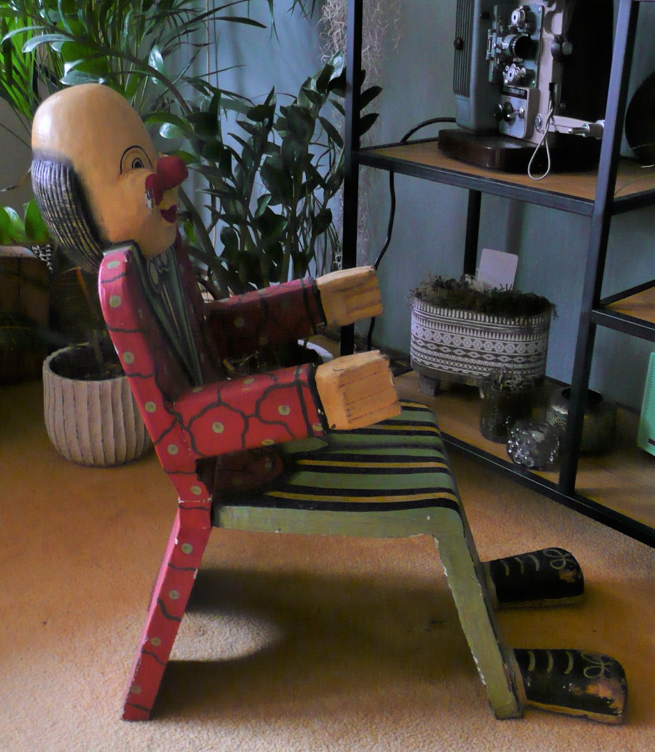 This vintage folk art, wooden child size chair is an eye-catcher. Clown style. This children's chair has a simple boxy look for his body with full size head. Arms and hands for the chair's arm rests with feet! The chair is used and does show wear and tear. For sitting or just a decorative piece. It is unmarked, and we do not know the manufacturer or chairs exact age.