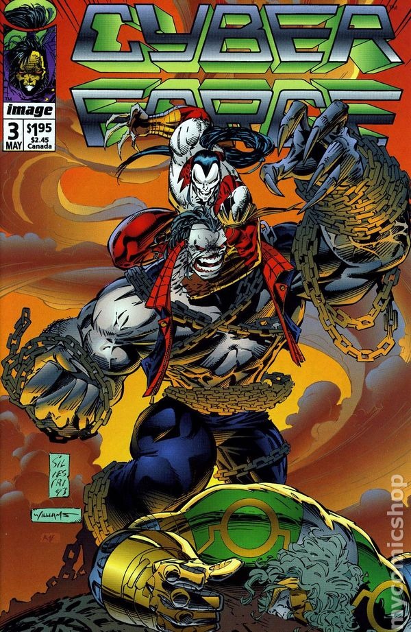 Cover pencils by Marc Silvestri, inks by Scott Williams. The Tin Men Of War Part Three, script by Eric Silvestri, pencils by Marc Silvestri, inks by Dan Panosian, Marc Silvestri, and Trevor Scott; While Cyberdata fights against three mutants who have stolen some integral software data, Cyberforce arrives to stop them, especially since they have kidnapped Velocity and T.I.M.M.I.E.; The superhero known as Pitt has been sleeping in the three mutants home and enters the fray, quickly taking Cyberforce's side; Meanwhile, Mother-May-I tries to brainwash Velocity and T.I.M.M.I.E but Velocity is able to shake it off quickly enough to escape with her young comrade; Meanwhile, Stryker makes moves to infiltrate Mother-May-I's gang. 36 pgs. $1.95. Cover price $1.95.
