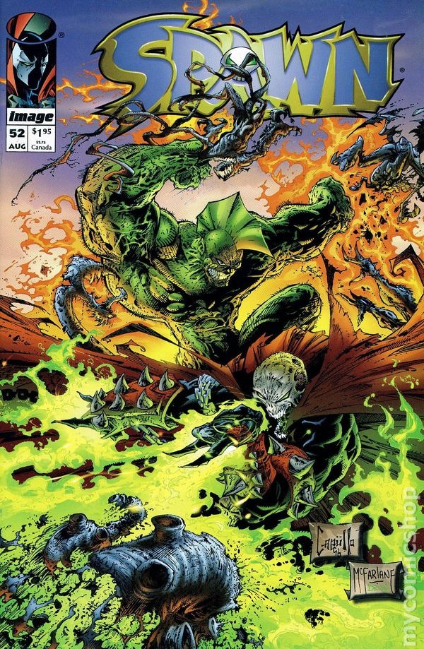 "Messiah!" Guest-starring Savage Dragon. Written by Todd McFarlane. Art by Todd McFarlane, Greg Capullo and Danny Miki. Cover by Todd McFarlane and Greg Capullo. Unbeknownst to either of her parents, the shoelace that lies with Cyan in her bed attached to her soother, is the only physical clue to Terry's mysterious recovery from cancer. Meanwhile, Terry's nightmares continue to reflect Al's experiences and he cant risk sharing his fears with Wanda. In another dimension, Spawn enters Hells fifth level where he is revered by the masses as a returning king and savior. Although he denies his status, he is forced into a confrontation with the Savage Dragon and they battle for the position of the Messiah. Spawn defeats the Savage Dragon and then draws the wrath of his worshippers by freeing him from their stoning. The dwellers of Hell turn on both of them and stone them to death…or do they? 32 pages, FC. NOTE: This issue is dedicated to Mark Gruenwald. Cover price $1.95.