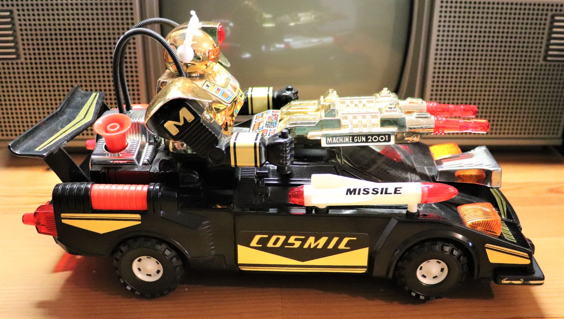 Zeer zeldzame Robot Cosmic Raider Force auto (werkt op 3 1,5 Volt batterijen, 'Engelse' staven). De auto werkt perfect: alle lichten doen het, alsmede het geluid. Als de auto ergens tegenaan botst, rijdt hij uit zichzelf iets achteruit en draait weg van het voorwerp om weer verder te kunnen rijden. De auto zit nog in de oorspronkelijke doos. Een prachtig stuk 'speelgoed' uit de 80-er jaren. Een echt collectors item in super staat.