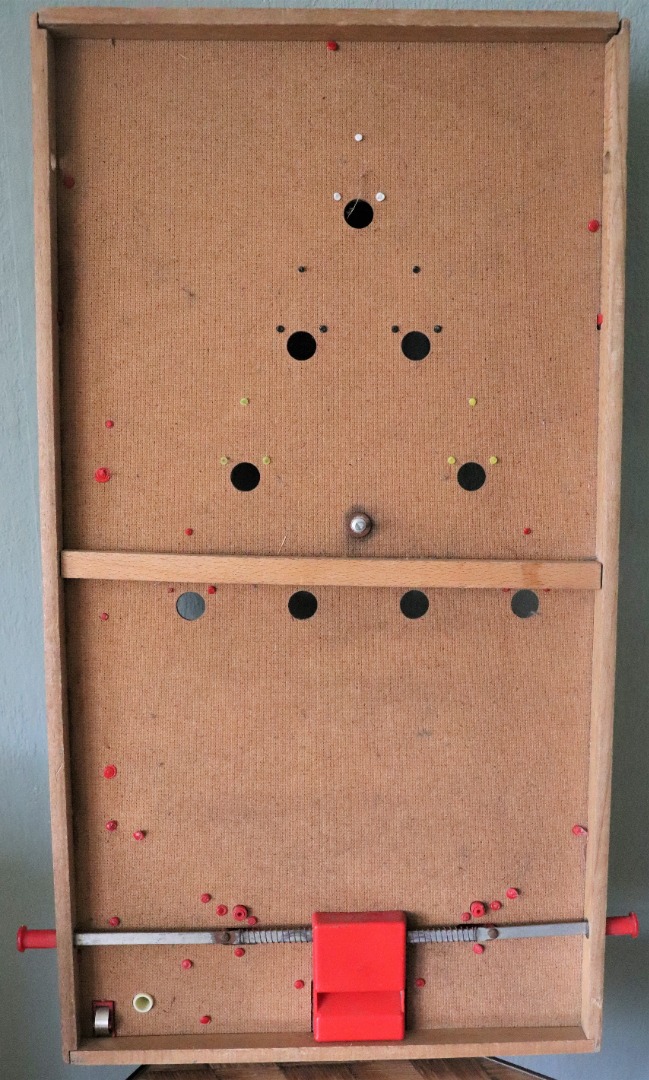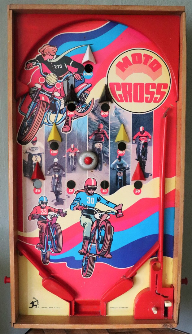 In goede staat verkerende tafel flipperspel in hout met kunststof onderdelen. De afbeelding vertoond een Moto Cross tafereel. Inclusief 1 kogel