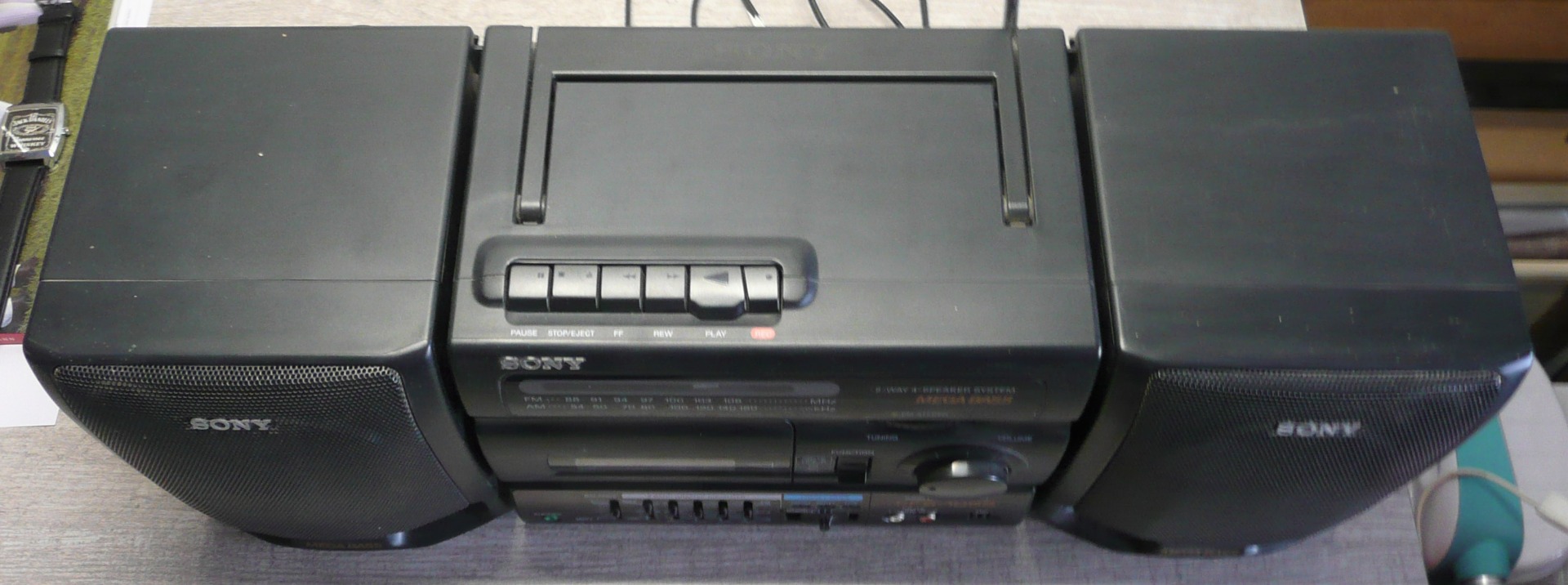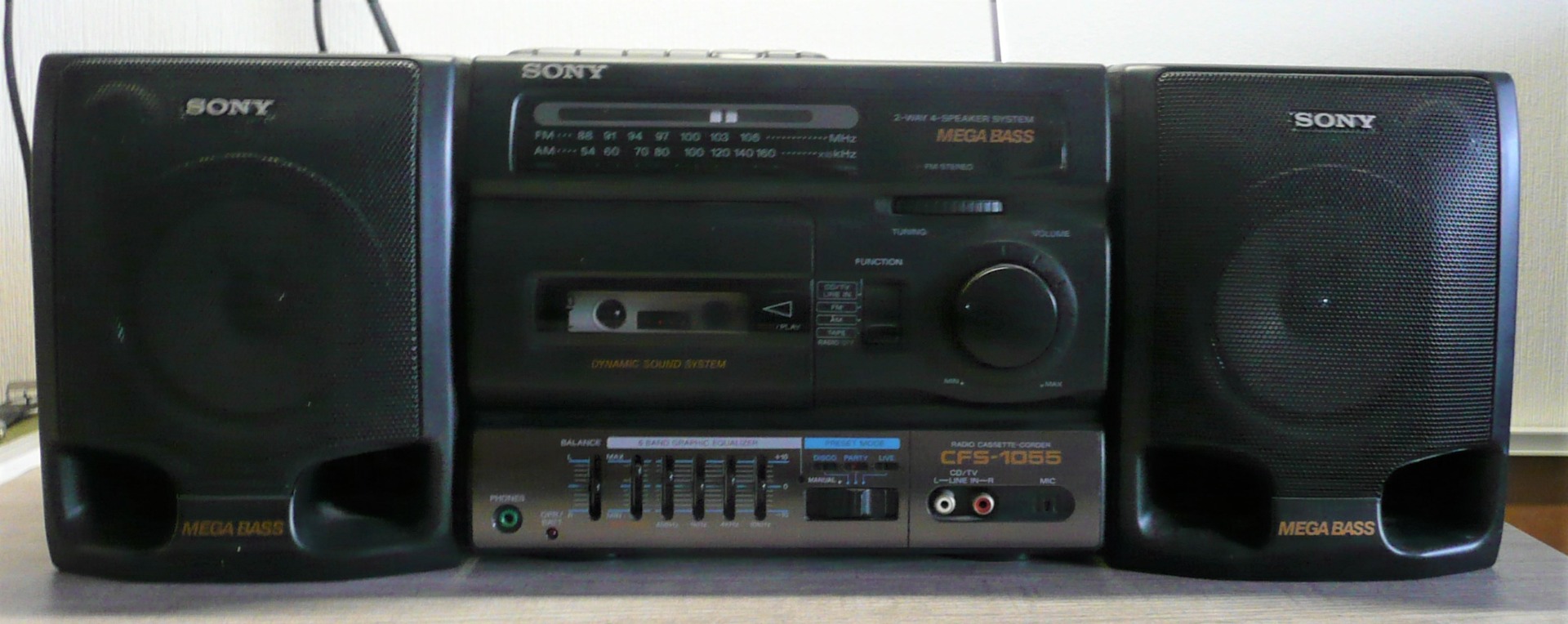 Radio Cassette recorder, Stereo, analog tuner MW, LW, SW, FM stereo, simple cassette deck, 5 bands grafic equalizer, dynamic sound system, CD in, mega bass system, mono/stereo FM switch, detachable speakers. |