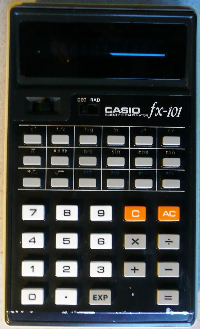 The Casio fx-101 is a scientific calculator with 10 digits precision and algebraic logic. It has 21 functions, 37 keys, and a VFD (vacuum fluorescent) display. The power source is 4xAA. The calculator was manufactured in Japan.