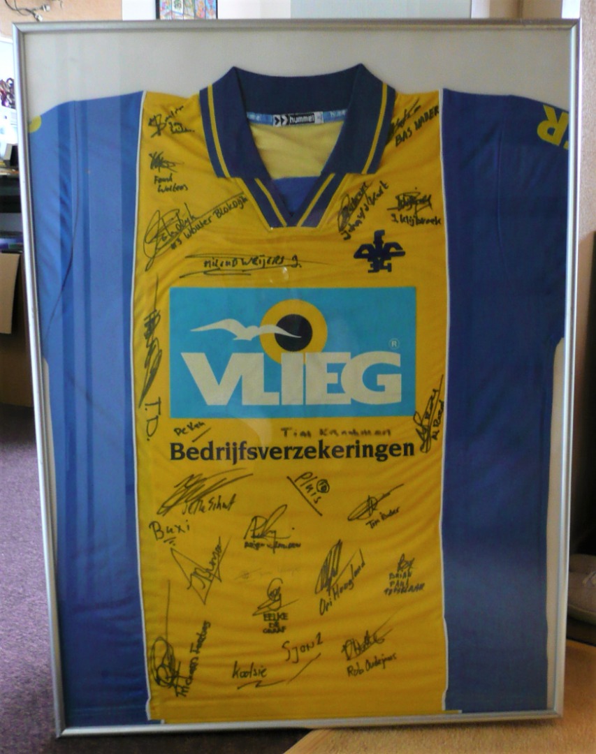 Dit shirt heeft jaren in het kantoor van Vlieg Bedrijfsverzekeringen gehangen.