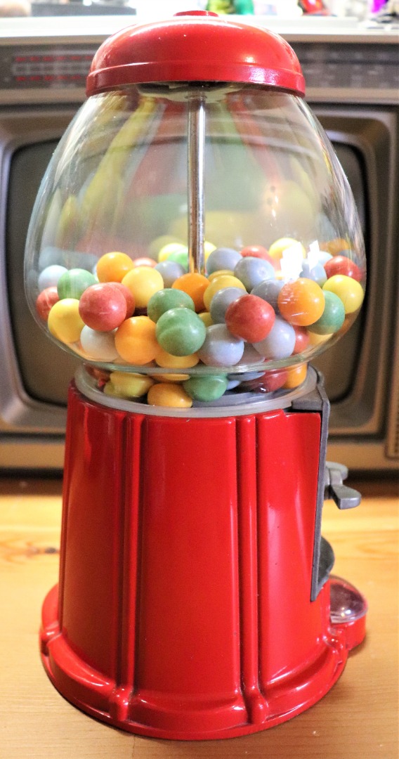 Werking is met 0.05, 0,10 en 20 cent, dan draaien en de kauwgom bal rolt eruit. Meegeleverd oude kauwgomballen.