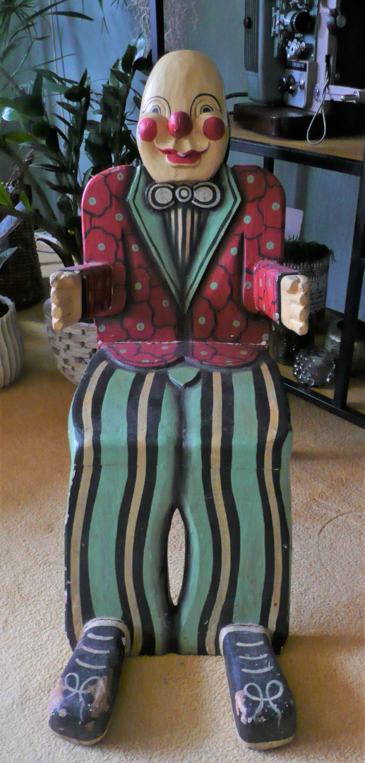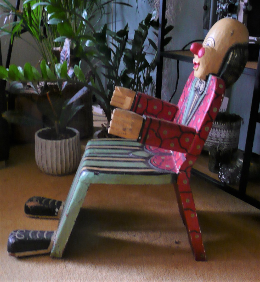 This vintage folk art, wooden child size chair is an eye-catcher. Clown style. This children's chair has a simple boxy look for his body with full size head. Arms and hands for the chair's arm rests with feet! The chair is used and does show wear and tear. For sitting or just a decorative piece. It is unmarked, and we do not know the manufacturer or chairs exact age.